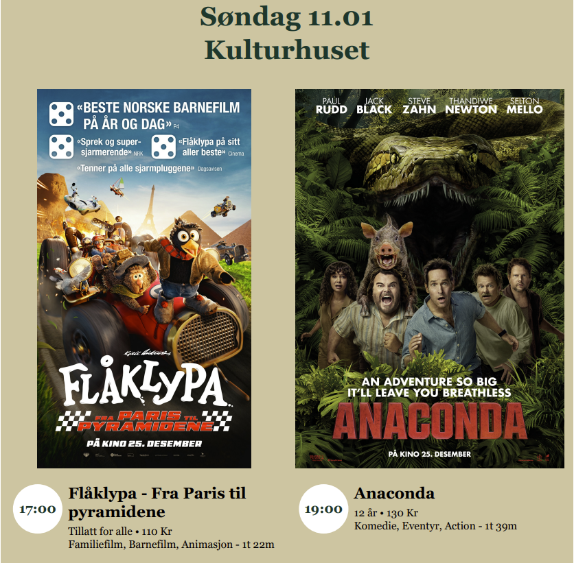 Sotnabeaivvi ođđajagimánu 11. b. dii. 17:00 ja 19:00 bovdet mii guovtti filbmačájáhussii. Álggos čájehuvvo norgga klassihkar Flåklypa ođđa hámis: Flåklypa fra Paris til pyramidene, filbma mii heive olles bearrašii. Maŋŋelaš, dii. 19.00, čájehuvvo actionkomediija Anaconda.