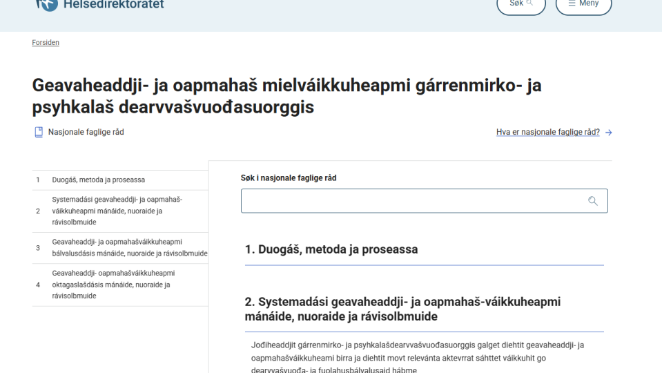 Nye faglige råd om brukermedvirkning nå tilgjengelig på samisk Helsedirektoratet har publisert nasjonale faglige råd om brukermedvirkning innen rus og psykisk helse på samisk. Dette skal bidra til bedre og mer lik... Publisert 24.04.2026 kl. 10.05